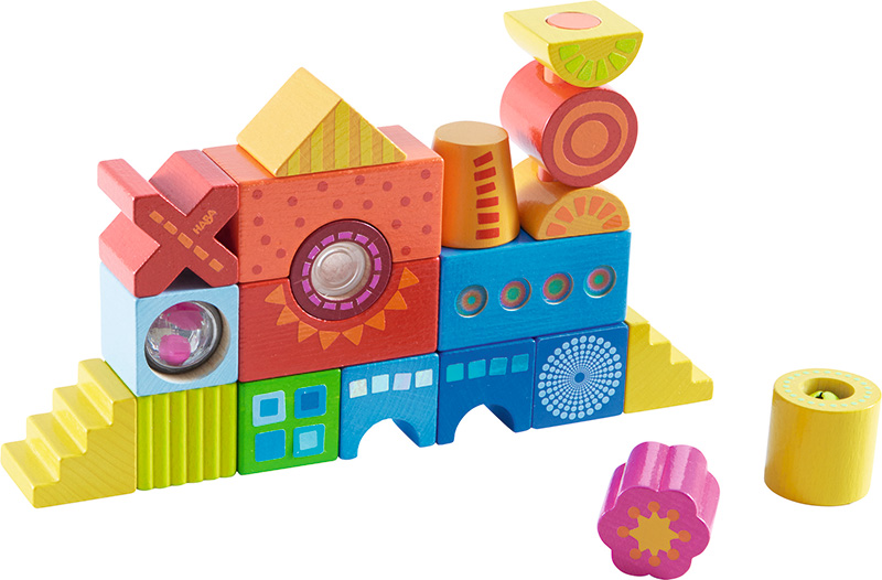用这些色彩缤纷的积木可以搭建各 种各样可爱的小塔,每个小塔都有 不同的特征—铃铛、窗口、摇铃球, 你可以充分发挥创造力,一块积木 接着一块,一座座奇妙的建筑就拔 地而起了,完美的刺激了小探险家 的所有感官。