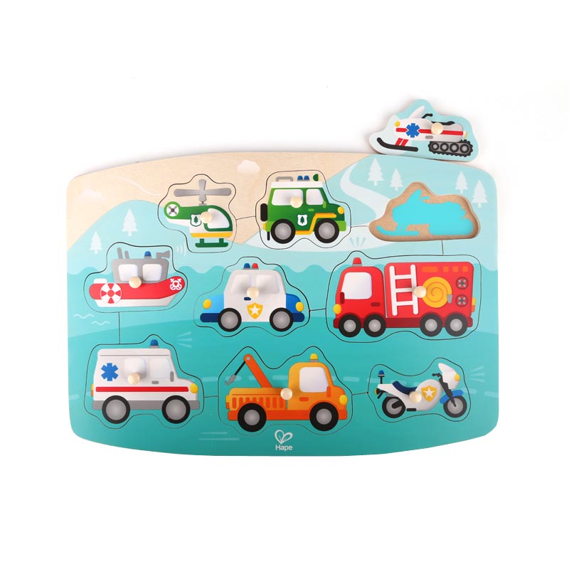 三阶拼图。趣味的急救主题中有九种急救车,小抓手有益于提升宝宝手指的抓握能力。