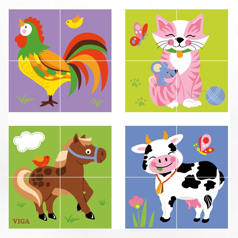 这是一款六合一立体拼图,由 4 个正方体积木组成,积木的每一面都印有不同的图案,幼儿可以发挥想象力和动手能力,拼出 6 组不同的图片。