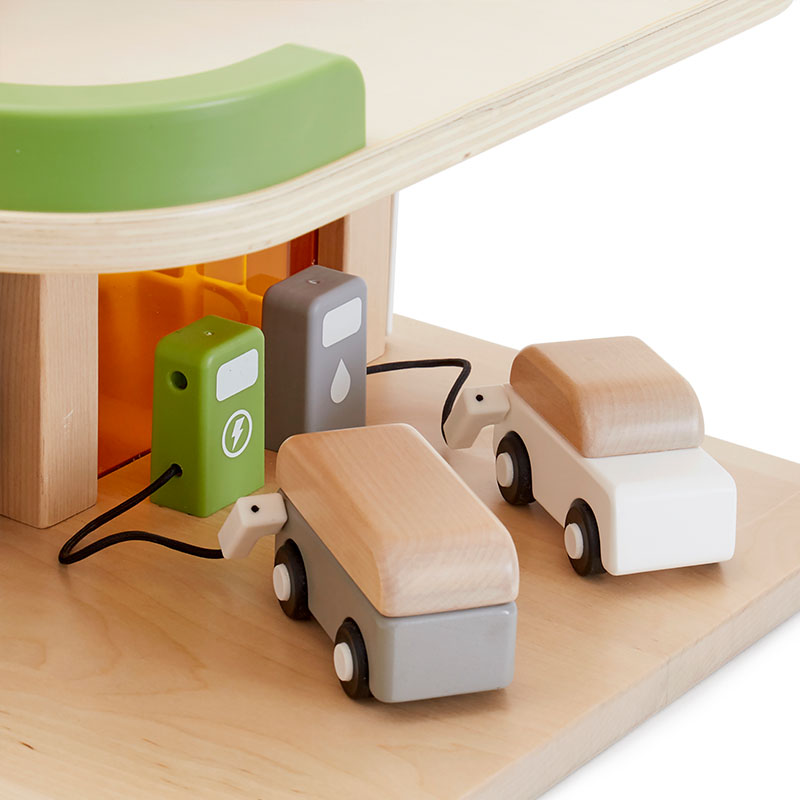用木制带电梯停车服务区来增强任何积木小镇的游戏体验。3岁及以上的 儿童可以通过使用洗车站、加油泵和电动汽车充电站进行戏剧性的游戏和 讲故事,然后让汽车沿着包括的斜坡或电梯飞速行驶。简化的木制汽车和 漂亮的彩色亚克力细节完美地补充了这套玩具。
